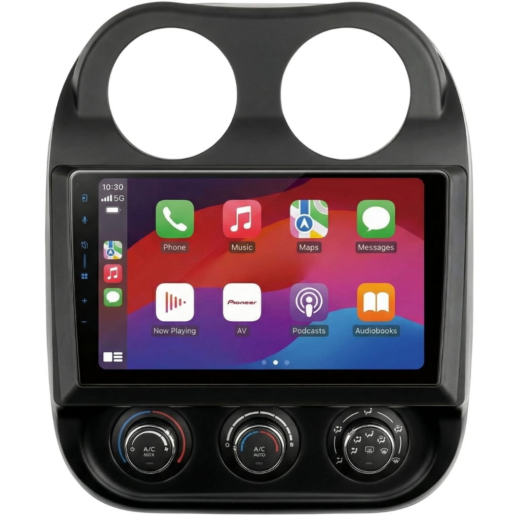 Complete installatiekit bestaande uit het 9'' Pioneer SPH-PF97BT Multimedia Systeem en een voertuigspecifiek 9'' Montageframe (zwart) voor de Jeep Compass ('10-'16), inclusief bekabeling en stuurwielinterface.
