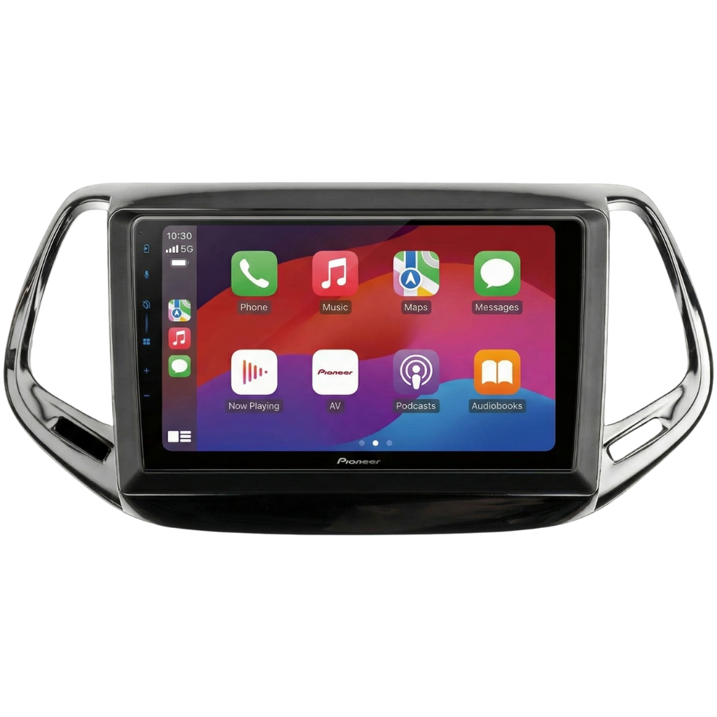 Complete installatiekit, bestaande uit het Pioneer SPH-PF97BT Multimedia Systeem en een voertuigspecifiek 9'' Multimedia Montageframe, geschikt voor de Jeep Compass ('17-) in de kleur Zwart, inclusief de benodigde bekabeling en stuurwielinterface.