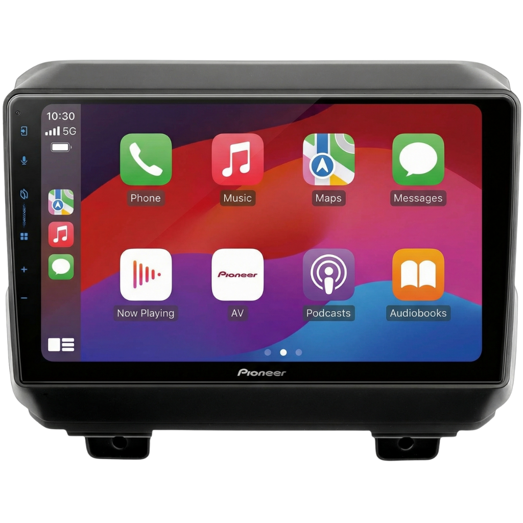 Complete installatiekit met het 9'' Multimedia Systeem (Pioneer SPH-PF97BT) en een voertuigspecifiek 9'' Montageframe (zwart) voor de Jeep Wrangler ('17-), inclusief bekabeling en stuurwielinterface.
