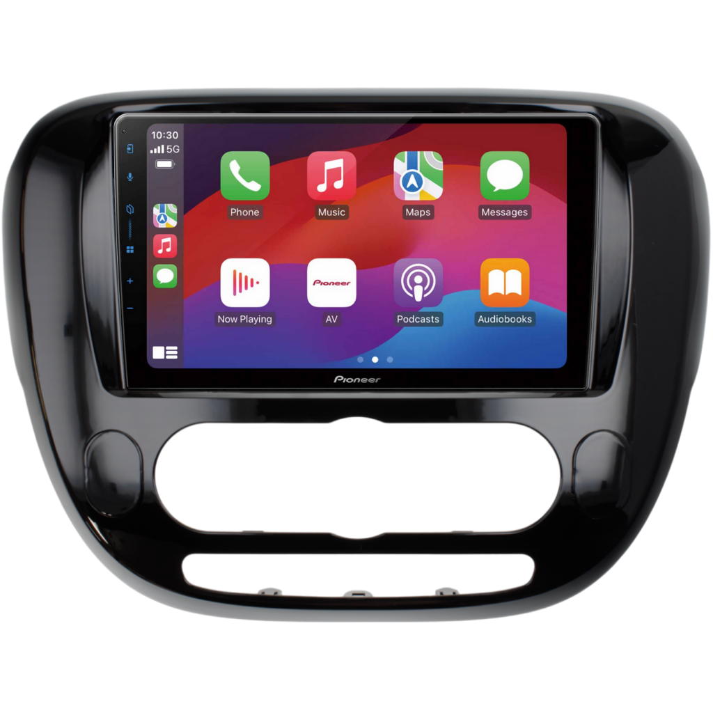 Complete installatiekit met het Pioneer SPH-PF97BT Multimedia Systeem en een voertuigspecifiek 9" Montageframe (Glanzend Zwart Dashboard) voor de Kia Soul ('14-'19) met Handmatige Airco, inclusief bekabeling en stuurwielinterface.