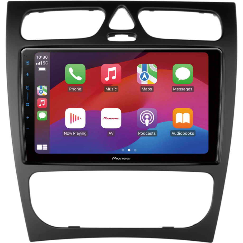 Pioneer SPH-F97BT 9" Multimedia Systeem voor Mercedes C-Klasse (W203, 2000–2004), zwart, inclusief autospecifieke bekabeling en stuurwielinterface.