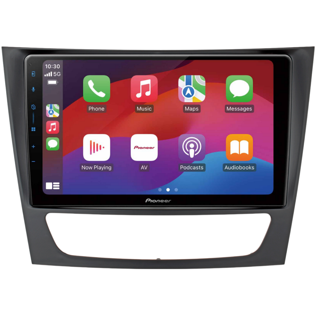 Pioneer SPH-F97BT 9" Multimedia Systeem voor Mercedes E-Klasse (W211, 2002–2009), zwart, inclusief autospecifieke bekabeling en stuurwielinterface.