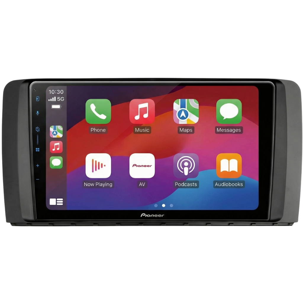 Complete installatiekit, uitgevoerd in Zwart, bestaande uit het Pioneer SPH-PF97BT Multimedia Systeem en een voertuigspecifiek 9'' Multimedia Montageframe, inclusief bekabeling en stuurwielinterface, geschikt voor de Mercedes R-Klasse (W251) modellen van 2006 tot 2010.
