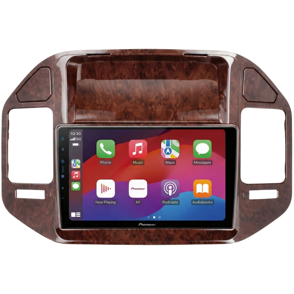 Complete installatiekit, bestaande uit het Pioneer SPH-PF97BT Multimedia Systeem en een voertuigspecifiek 9" Montageframe (Hout-imitatie) voor de Mitsubishi Montero ('00-'07), inclusief bekabeling en stuurwielinterface, waarbij de omlijsting niet Plug-and-play is en het bovendisplay standaard niet behouden blijft.