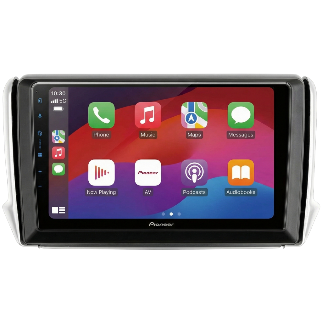 Complete installatiekit voor de Peugeot 2008 ('14-) in de kleur Zwart/Zilver, bestaande uit het 9'' Pioneer SPH-PF97BT Multimedia Systeem, een voertuigspecifiek 9'' Montageframe en inclusief bekabeling en Stuurwielinterface.