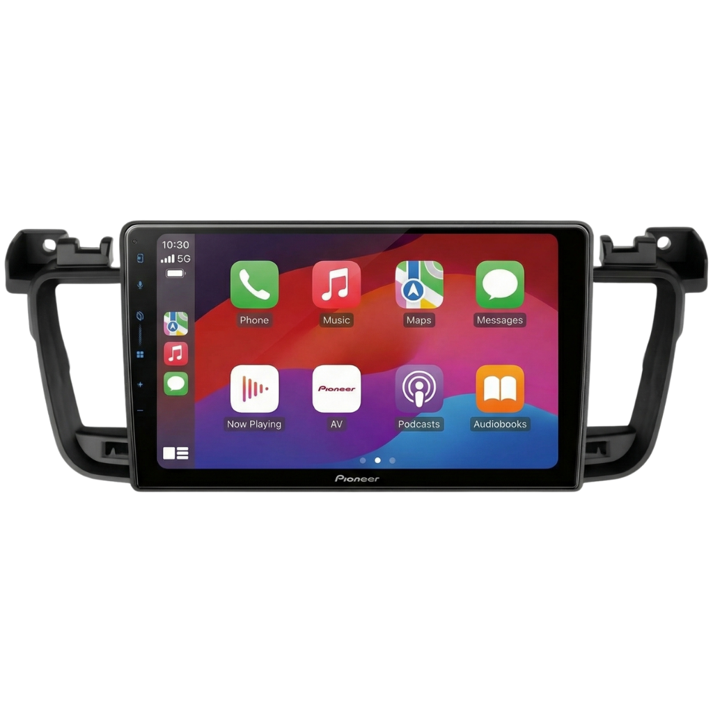 Pioneer SPH-F97BT 9" Multimedia Systeem voor Peugeot 508 (2011–2017), zwart, inclusief autospecifieke bekabeling en stuurwielinterface.