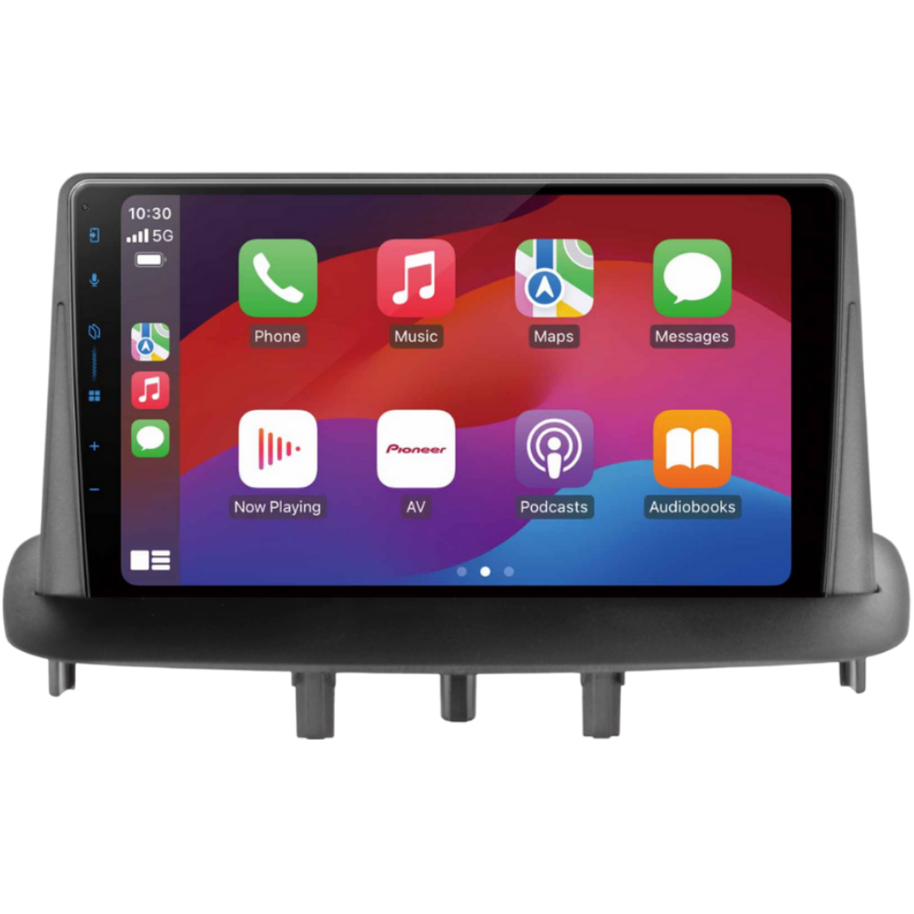 Complete installatiekit bestaande uit het 9'' Pioneer SPH-PF97BT Multimedia Systeem en een voertuigspecifiek 9'' Montageframe (kleur: Zwart) voor de Renault Megane 3 ('09-'14), inclusief bekabeling en stuurwielinterface, waarbij de originele display aangesloten en verborgen moet blijven.