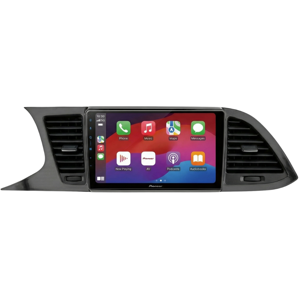 Pioneer SPH-F97BT 9" Multimedia Systeem voor Seat Leon (2013–2018), hoogglans zwart, inclusief autospecifieke bekabeling en stuurwielinterface.