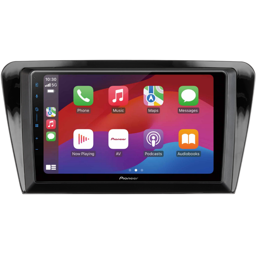 Complete installatiekit bestaande uit het 9'' Pioneer SPH-PF97BT Multimedia Systeem en een voertuigspecifiek 9'' Multimedia Montageframe in Glanzend Zwart, geschikt voor de Škoda Octavia ('13-'17), inclusief bekabeling en stuurwielinterface.