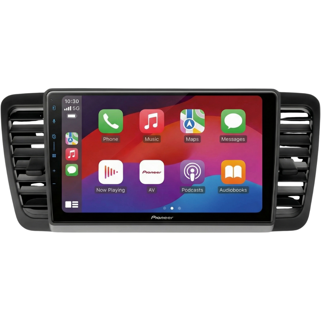 Pioneer SPH-F97BT 9" Multimedia Systeem voor Subaru Legacy (2004–2009) en Outback (2004–2009), inclusief autospecifieke bekabeling en stuurwielinterface.